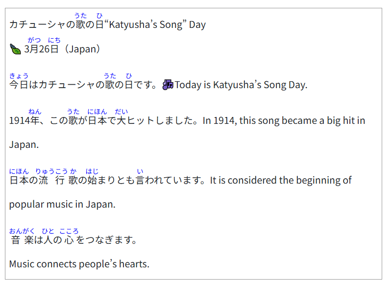 今日はカチューシャの歌の日です。 Today is Katyusha’s Song Day.